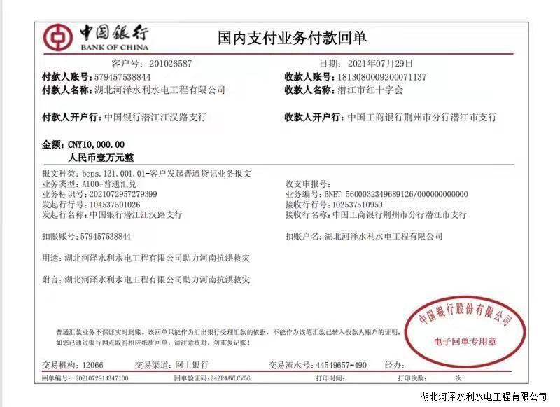 近日,河南省突遭百年不遇罕见的大暴雨牵动人心。7月29日,公司在董事长王兰成的带领下向潜江市红十字会捐款壹万元,助力河南抗洪救灾、重建家园。